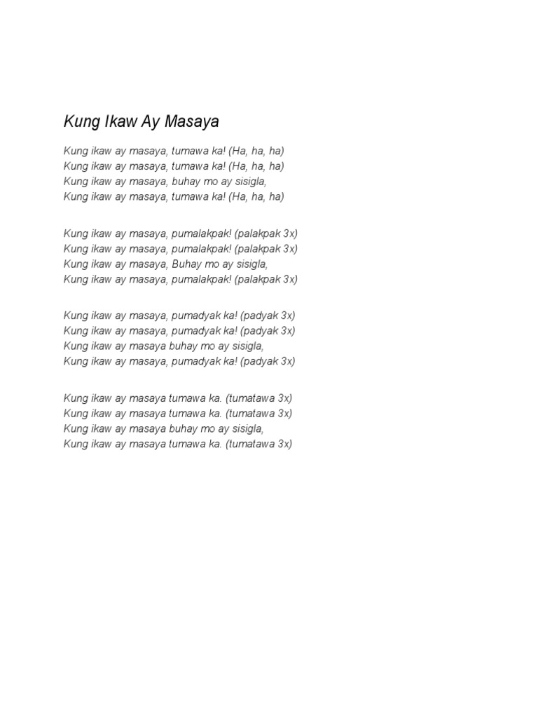 Play online or download to listen offline free - in HD audio only on JioSaavn. Kung ikaw ay masaya pumalakpak Kung ikaw ay masaya pumalakpak Kung ikaw ay masaya kung ikaw ay masaya Kung ikaw ay masaya pumalakpak. Klap klap Kung ikaw ay masaya Buhay mo ay sisigla.